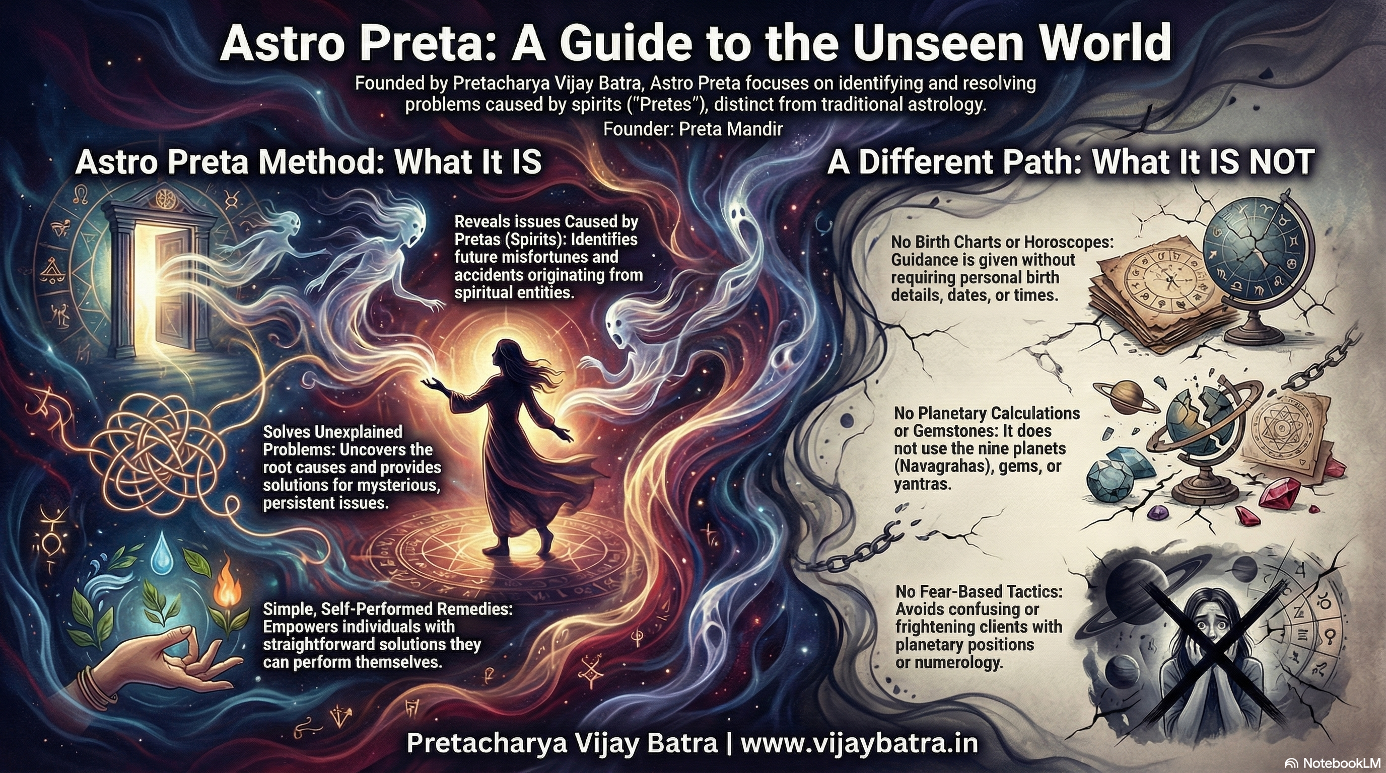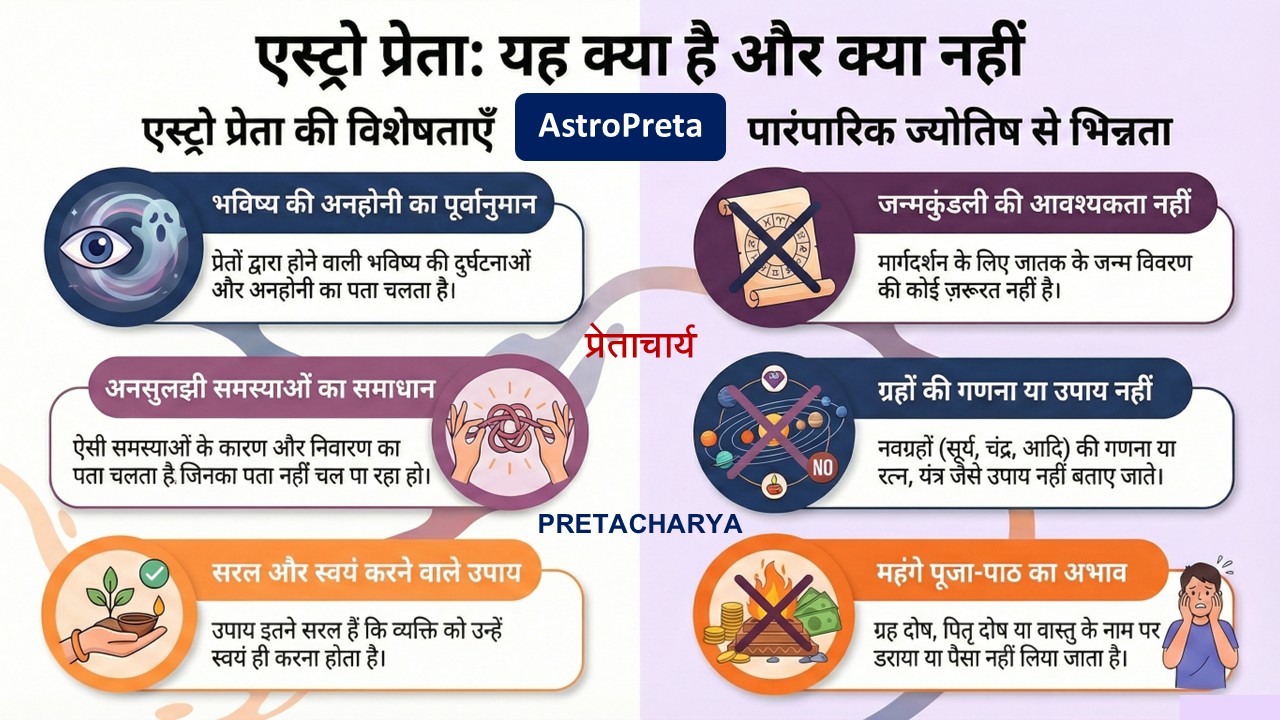 Pretacharya Vijay Batra provides daily, weekly, monthly, and yearly predictions based on messages received from Preta (spirits), indicating which days of the month the individual may face unwanted troubles, obstacles in tasks, sudden losses, undetected mental and physical health problems, or financial issues caused by Preta.